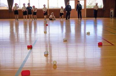 目標とするボール(目標球)に、白と赤それぞれのお手玉を投げたり転がしたりして、自分のお手玉をより目標球に近づけることを競い合います。